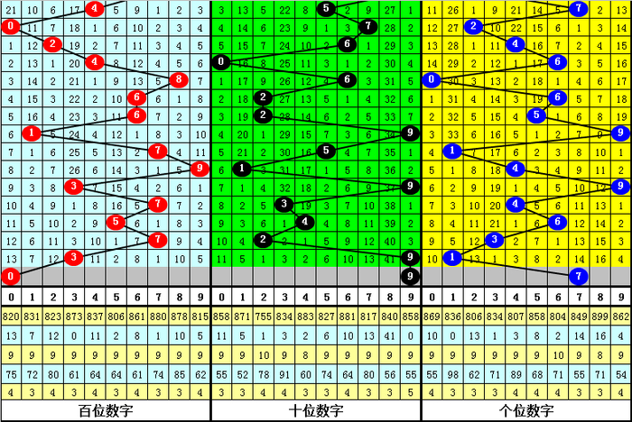 百位上期开出号码3,下降4点位,本期关注该位再次下降,参考号码0。