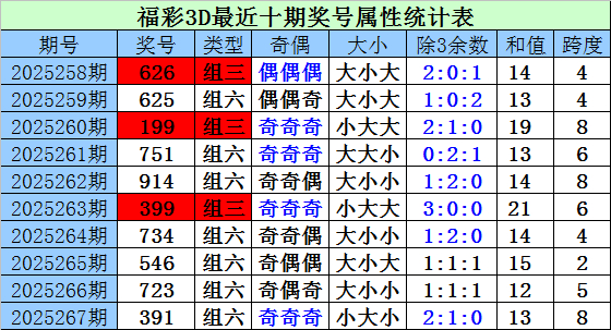 上期回顾:上期开奖奖号为391,类型:组六,奇奇奇,小大小,2:1:0,和值13,跨度8。