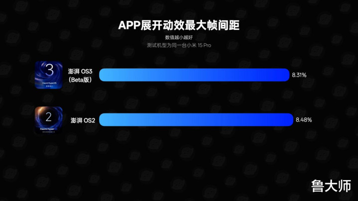 那么在体现App展示动效细腻程度的最大帧间距测试中,澎湃OS 3以8.31%的微弱优势领先了澎湃OS 2。
