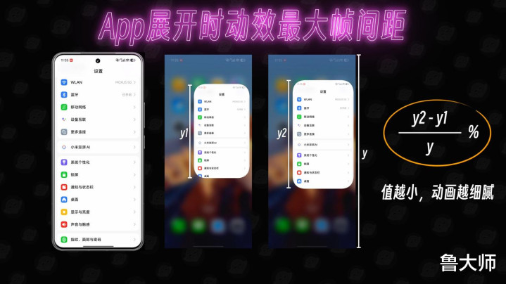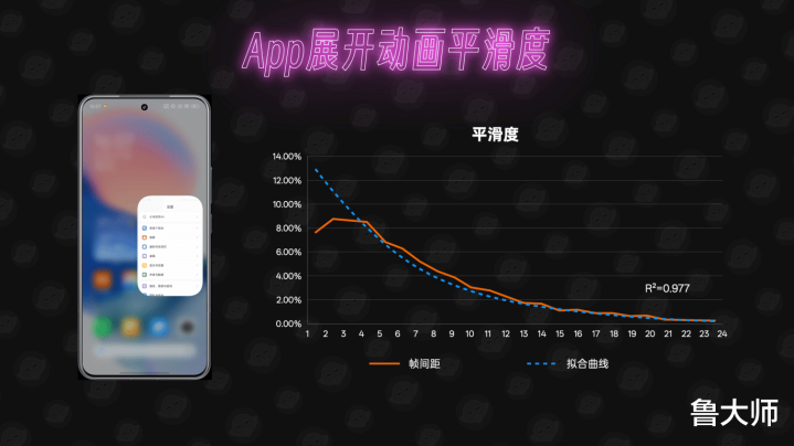 针对系统动效流畅度,鲁大师实验室则凭借“App展开时动效最大帧间距”以及“App展开动画平滑度”两项测试指标来判断。其中,“App展开时动效最大帧间距”指标反映的是App展开过程中,每一帧的时间内,图像变化的长、宽与屏幕边长的比值,数值越小代表动画越细腻。