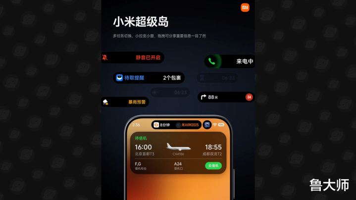 首先就是鲁Sir开头所说的这个“小米超级岛”。除了常规的信息显示——计时、录音、通话、快递、导航等等。有点吊的是,小米超级岛最多支持三个应用进程同时上岛,其它家系统一般是两个,而且超级岛上的三个卡片能做到随意切换,动画也比较丝滑。