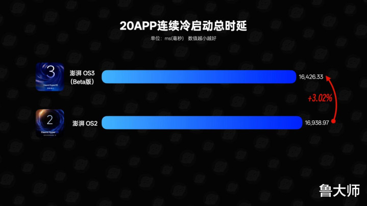 最后,咱也进行了20款App连续冷启动这样的高负载测试。从测试数据结果来看,澎湃OS 3冷启动总时延为16426.33ms,比澎湃OS 2大概快出3.02%。这个提升虽然不大,但至少说明在重度使用场景下,OS 3还是有点东西的。